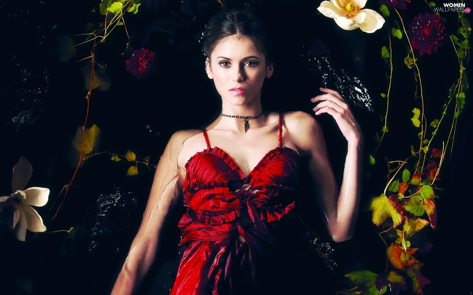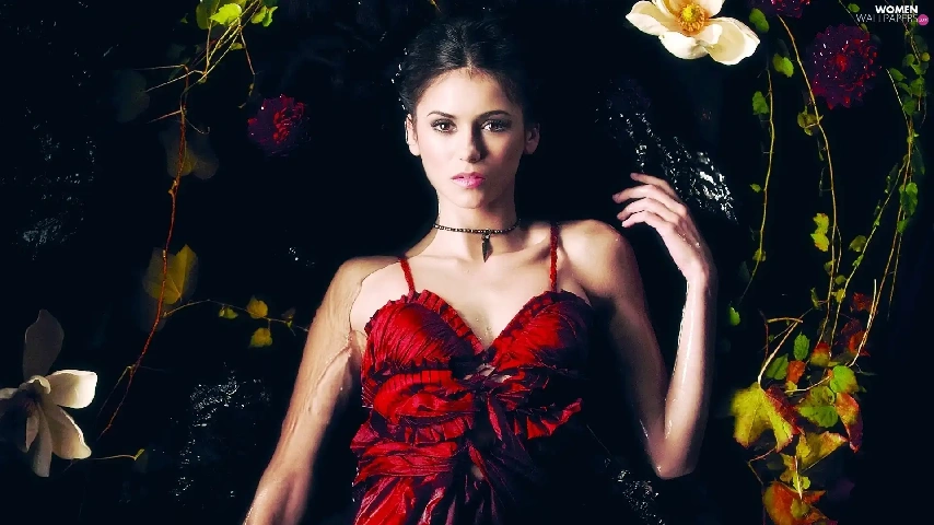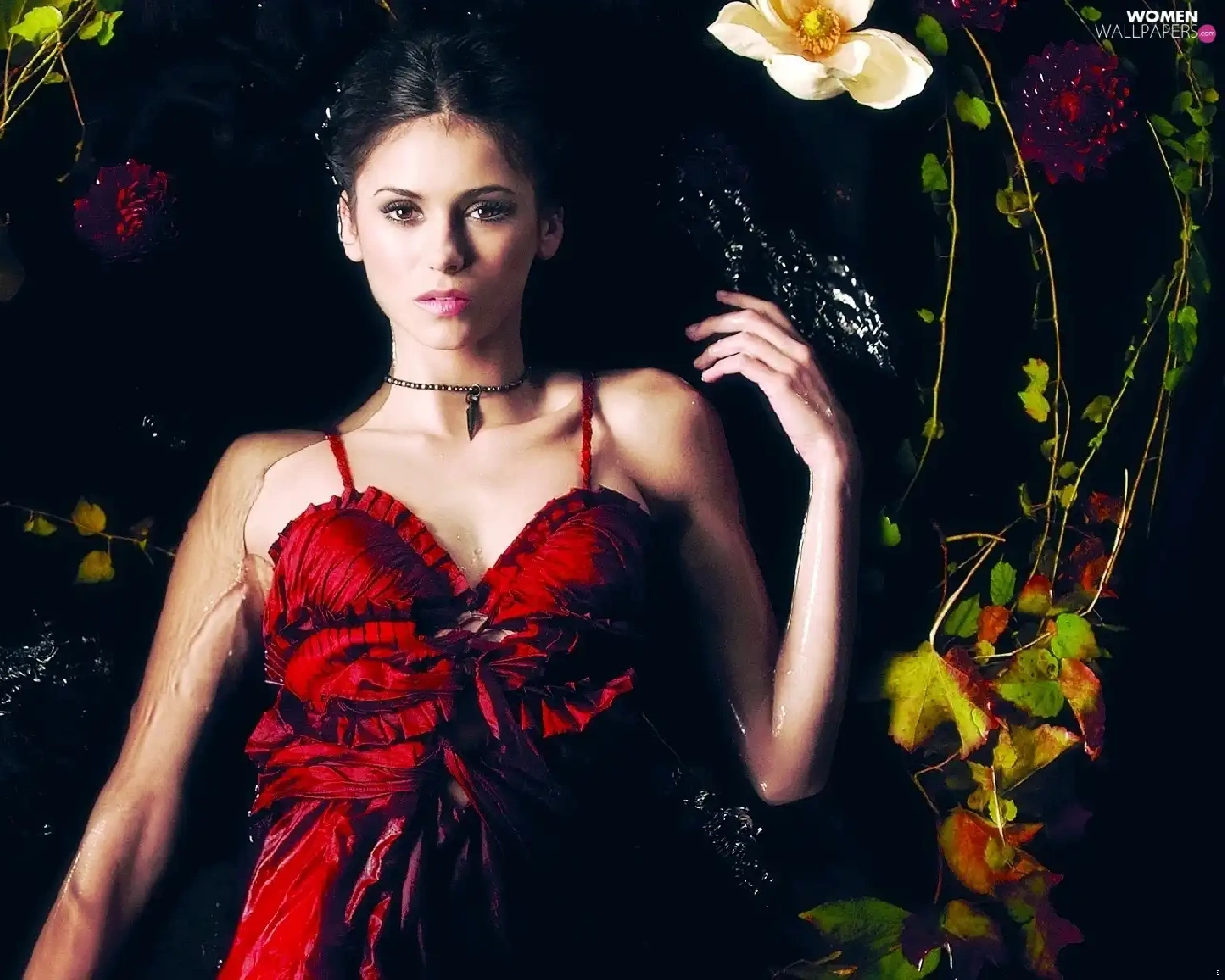 dress, Nina Dobrev, Leaf, Flowers, water, red hot