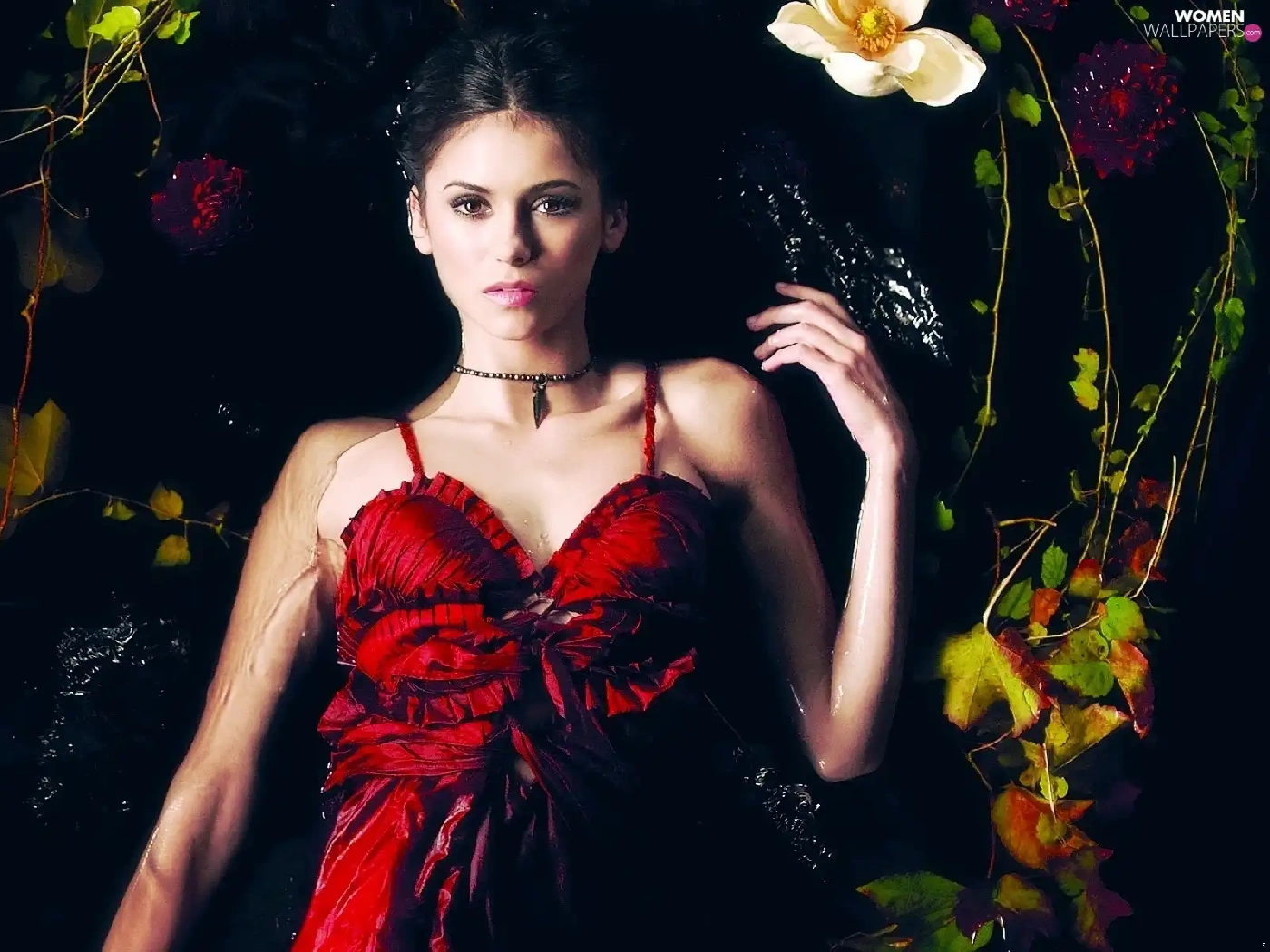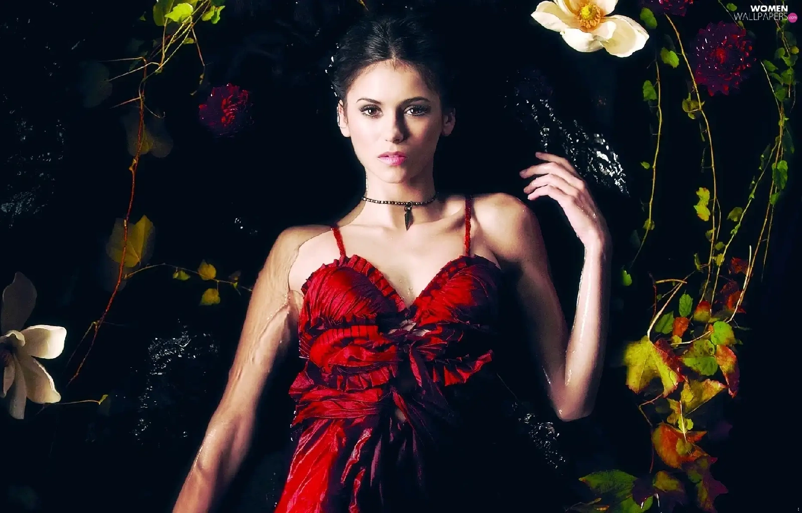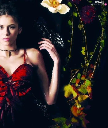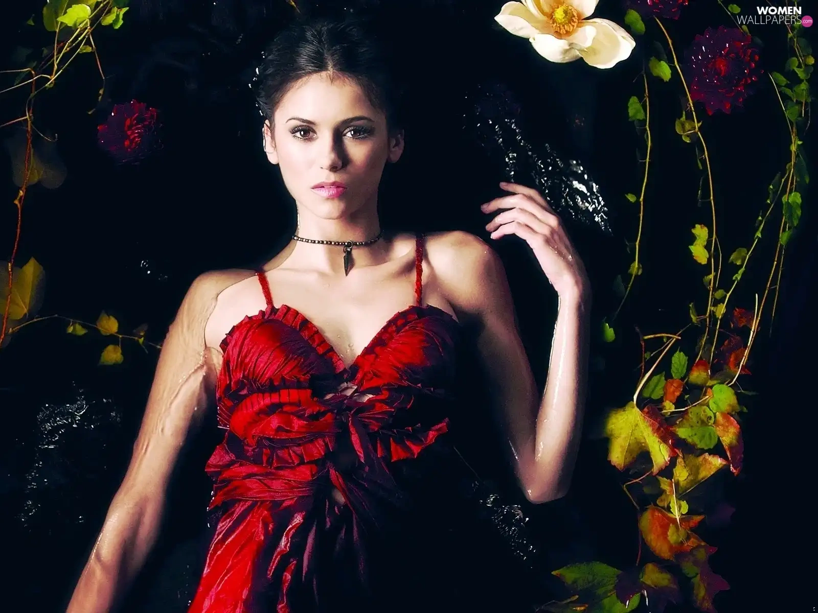 dress, Nina Dobrev, Leaf, Flowers, water, red hot