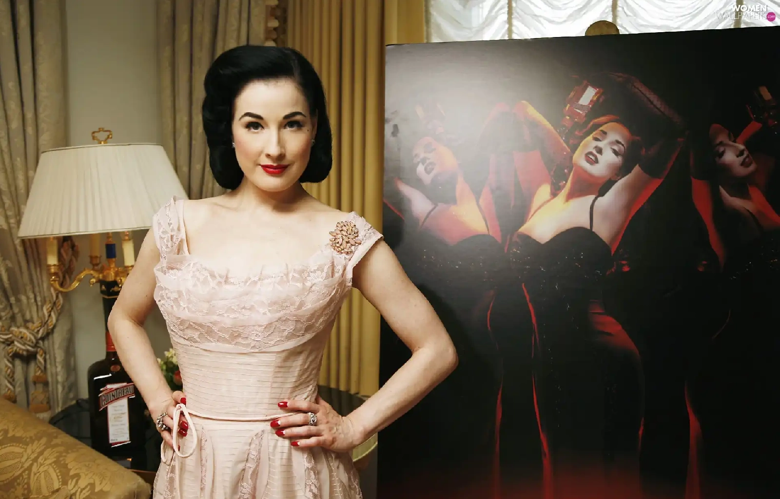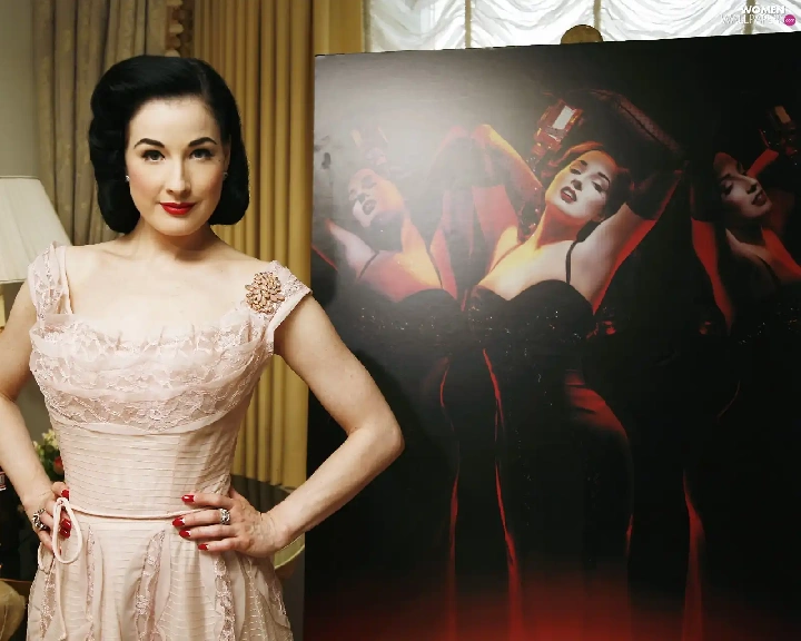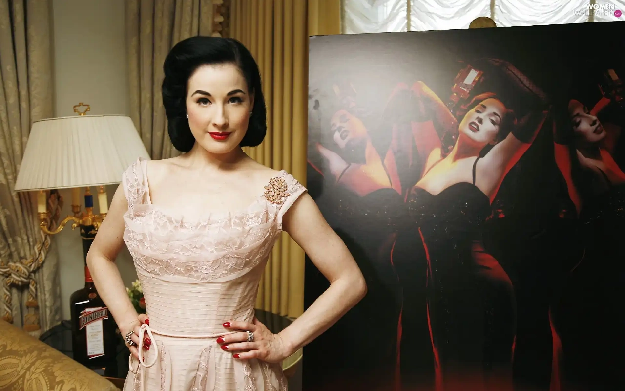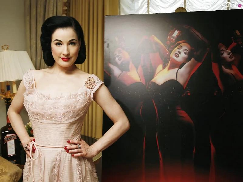 Dita Von Teese, jewellery, make-up, dress