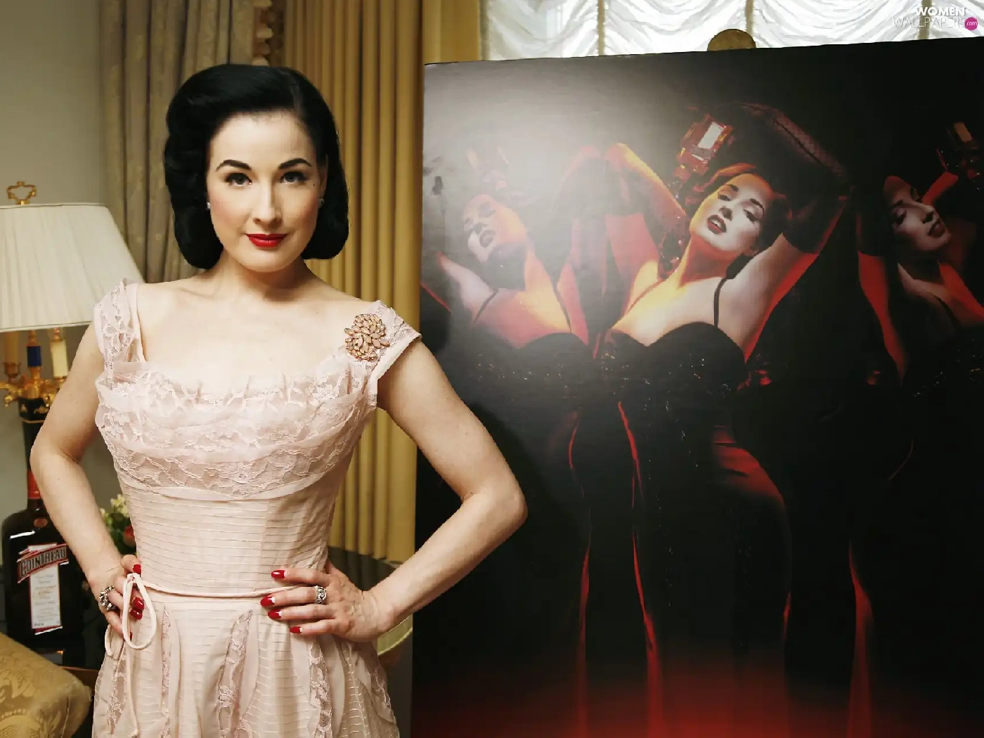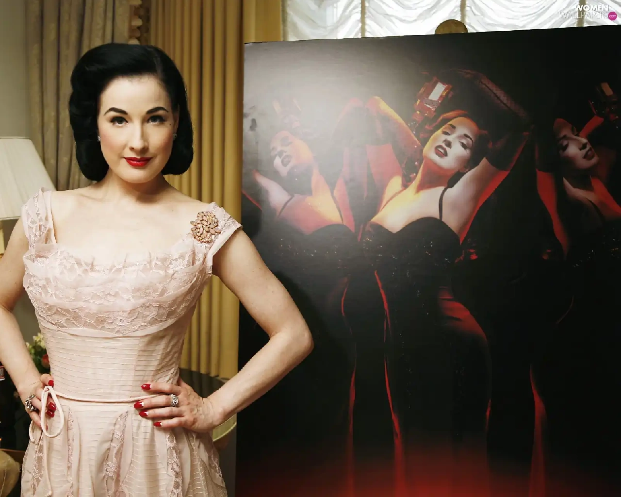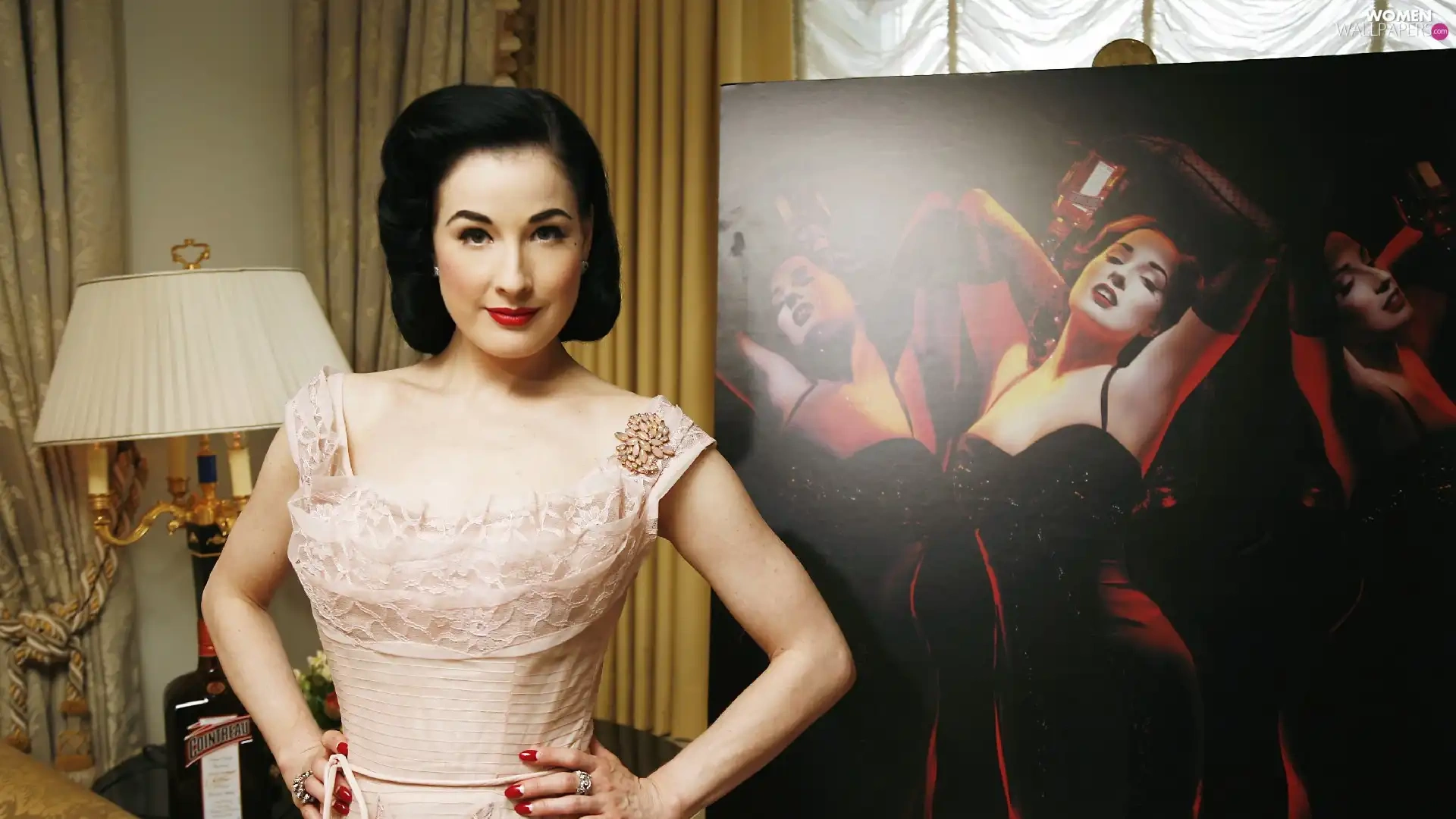 Dita Von Teese, jewellery, make-up, dress
